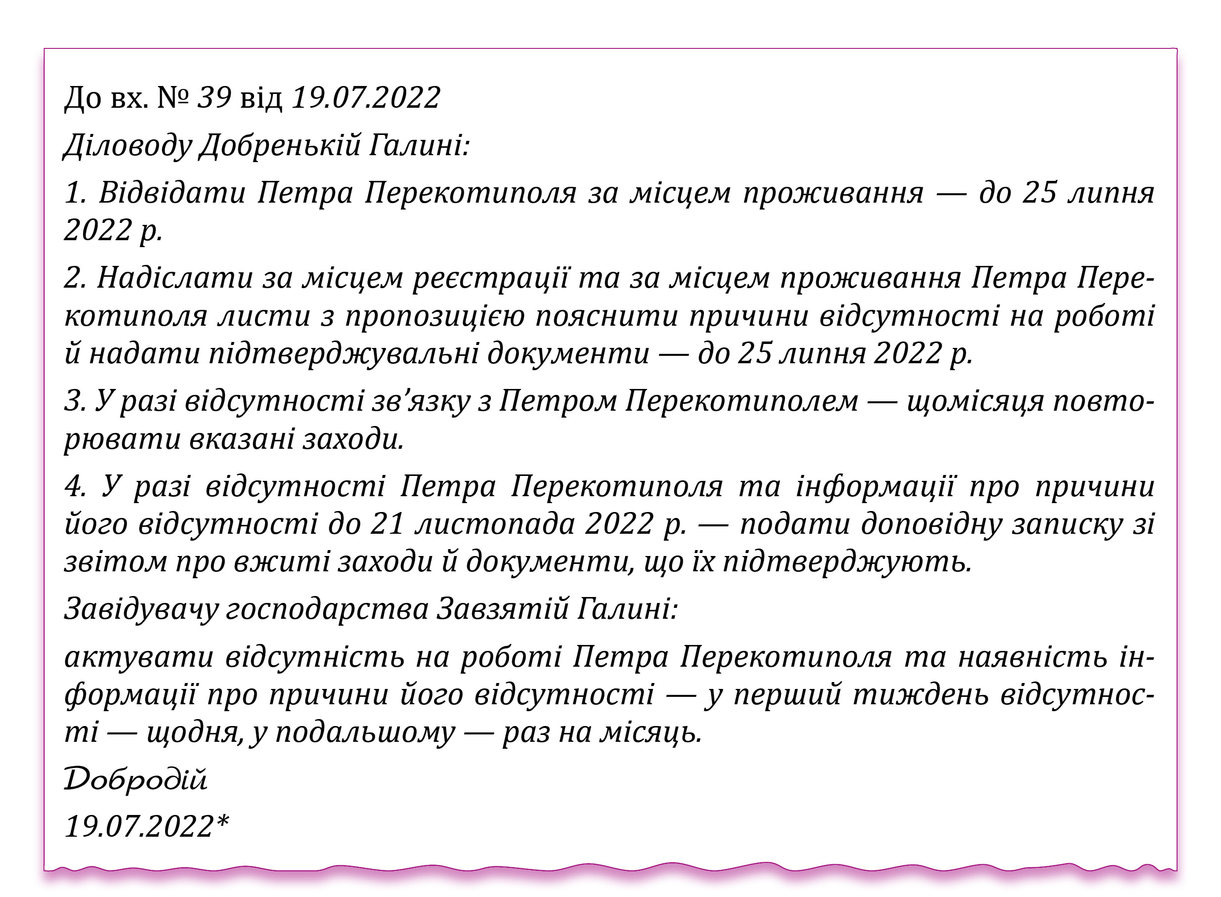 Ви як керівник закладу ухвалюєте рішення про додаткові заходи. Після того як розглянете доповідну записку безпосереднього керівника відсутнього працівника, маєте ухвалити рішення про розслідування причин відсутності працівника на роботі та визначити виконавців розслідування — безпосередній керівник відсутнього працівника, секретар, один із заступників керівника закладу тощо. Рішення оформлюйте у вигляді резолюції на доповідній записці керівника працівника: