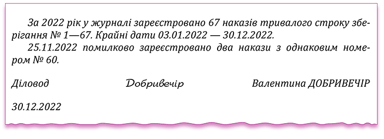 Якщо помилилися в номері наказу, а його вже проставили і в журналі реєстрації, і на самому документі, не робіть жодних виправлень. Зазначте помилку в підсумковому записі, який зробите після завершення діловодного року, засвідчте підписом особи, відповідальної за ведення записів.