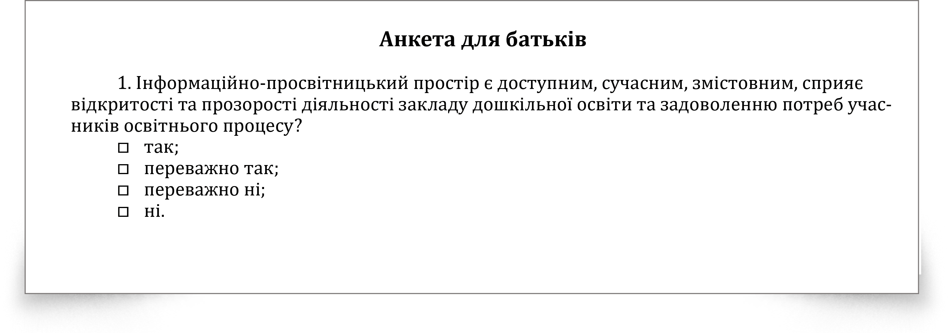 Приклади анкет для педагогів і батьків, наведені у Додатках 32, 33.